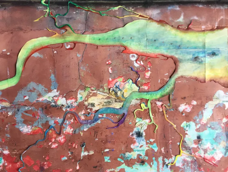 A map of the river Thames, water coloured to camouflage with an old, peeling wall that has enjoyed layers of graffiti over the years.