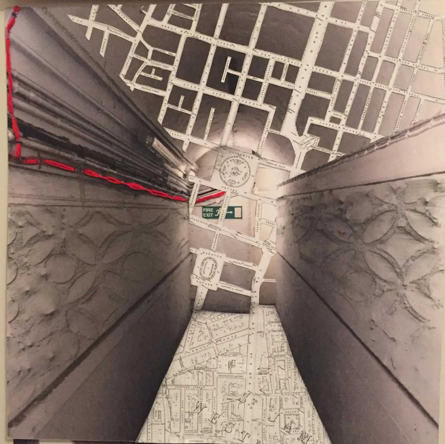 A series of collages inspired by a Georgian house in the midst of London’s historic tailoring district. The photographs were taken in the course of my work as a conservation architect prior to restoration work, depicting some of the architectural features to be preserved in the building. My artistic intervention alludes to the tailoring tradition and includes sewing into the photographs.