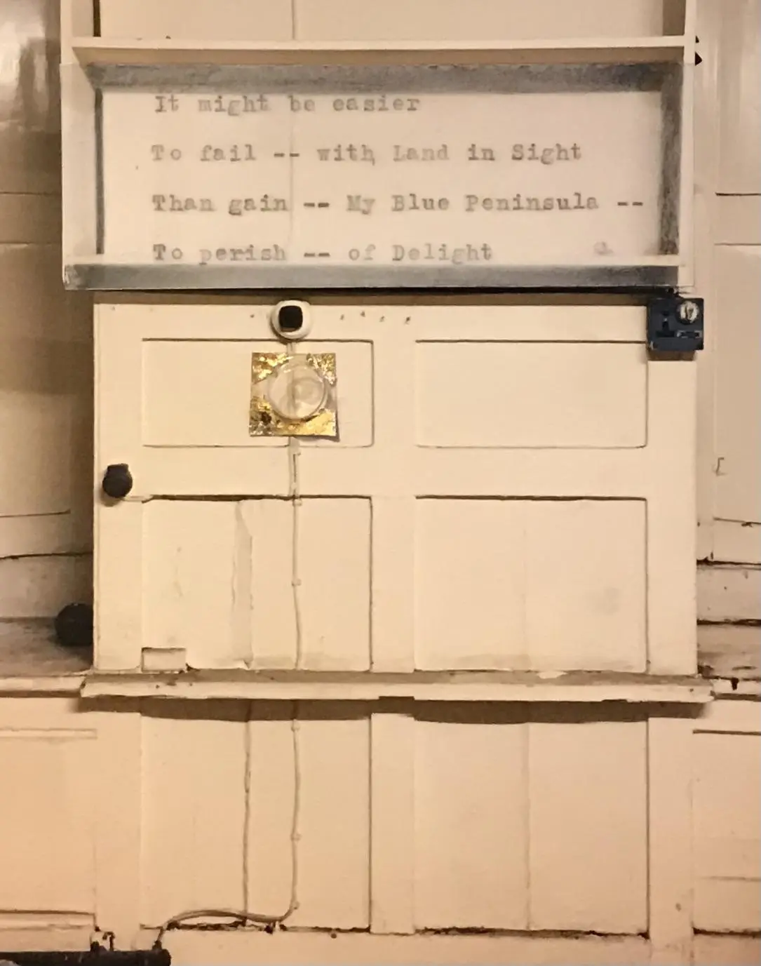 This work is dedicated to my mother Lily. The triptych of mixed media collages alludes to the development of agoraphobia that affected her later in her life. It references the American poet Emily Dickinson who my mother admired and who experienced a similar condition. The artist Joseph Cornell dedicated a collage to Emily Dickinson entitled ‘Towards the Blue Peninsula’ , and I have incorporated a typed verse from the poem into the central panel.