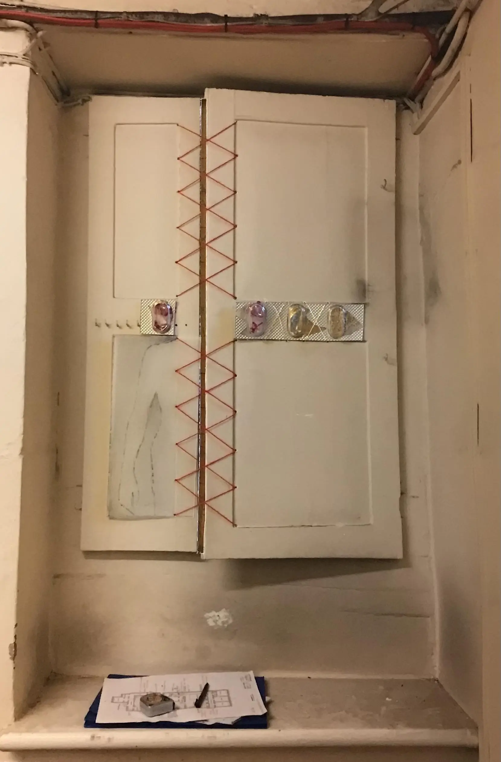 I took the photographs in the course of my work as a conservation architect in a historic building situated in the midst of London’s tailoring district. This has inspired the use of sewing into the paper as the shutters are closing in.