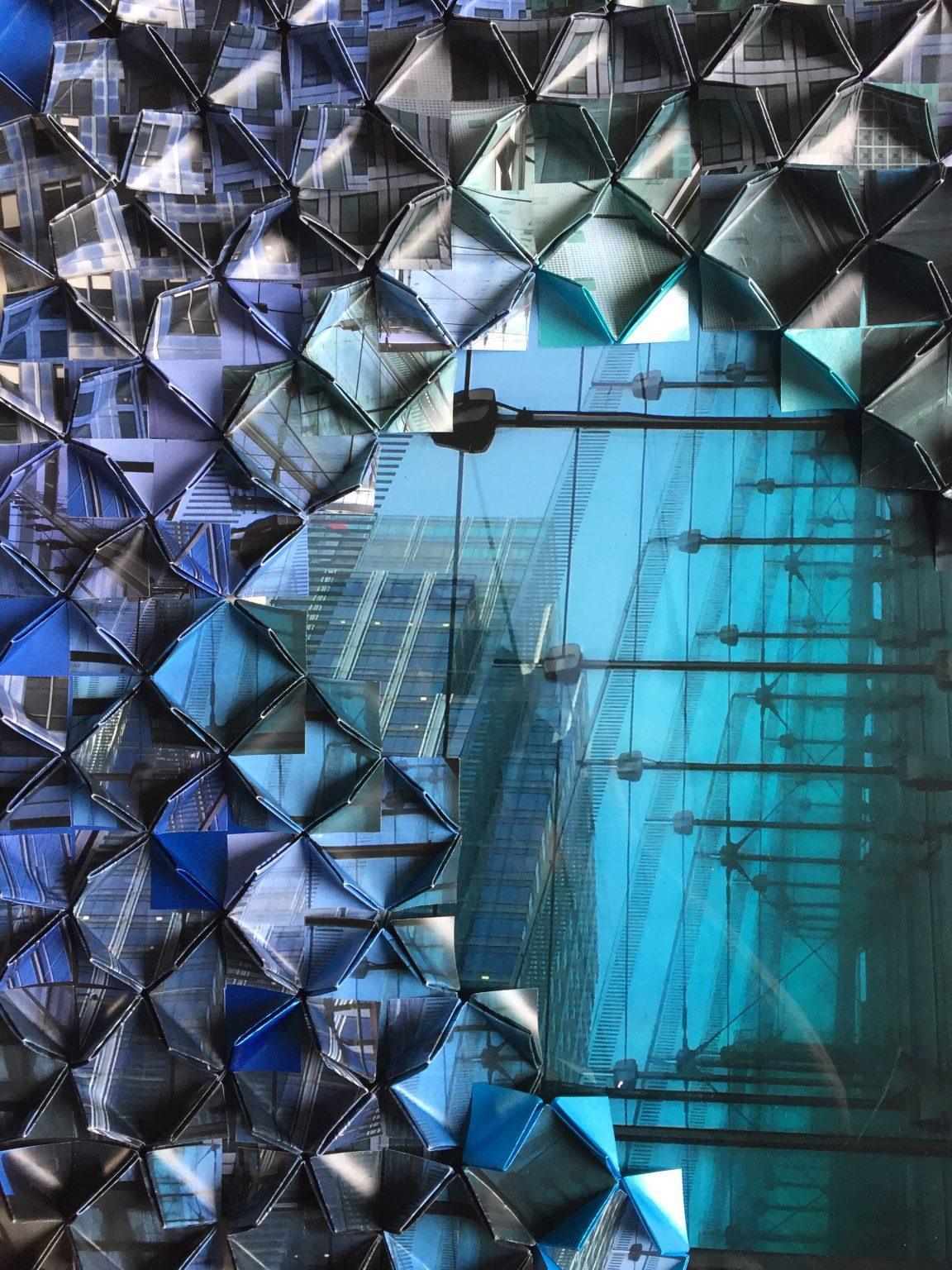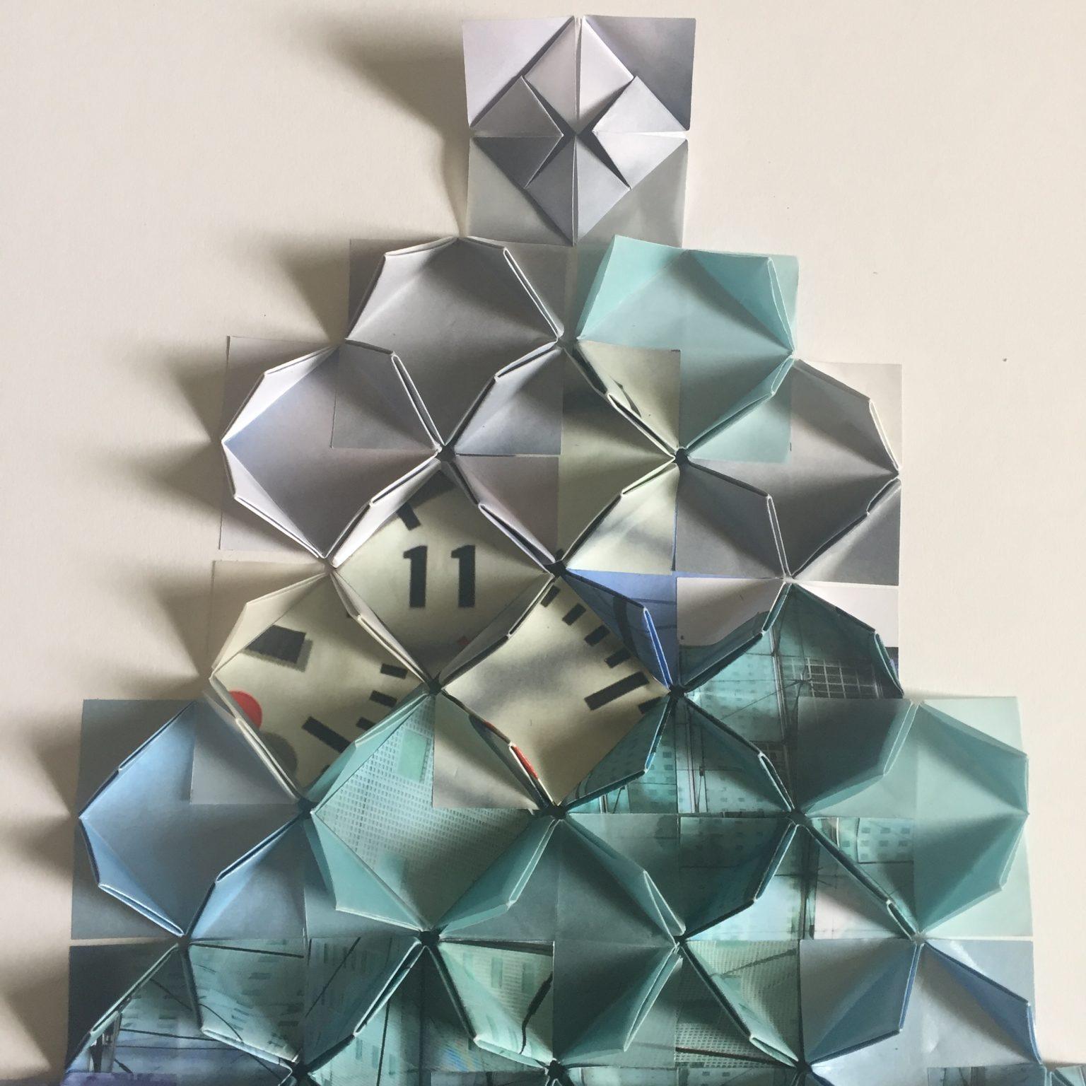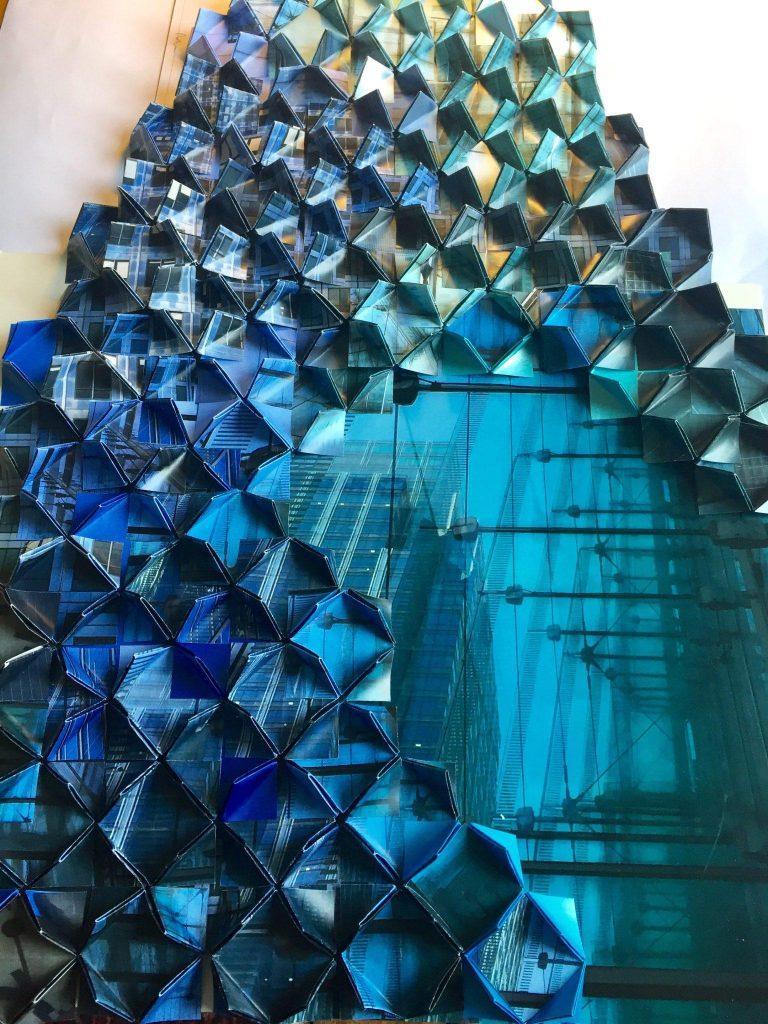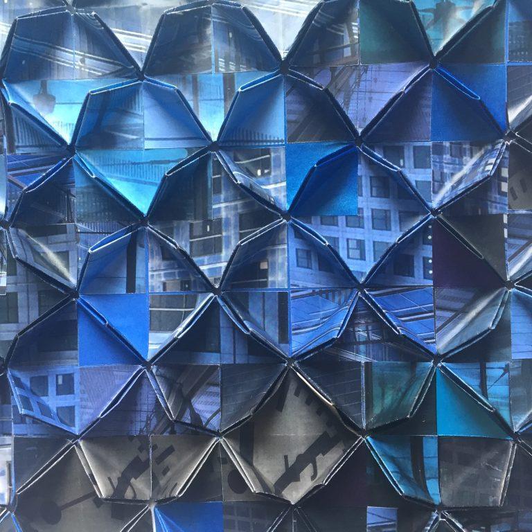 A three-dimensional tessellated collage: Photographs, decorative papers. This work expresses in three dimensions the architectural details that characterise the iconic hub of glass towers at Canary Wharf.